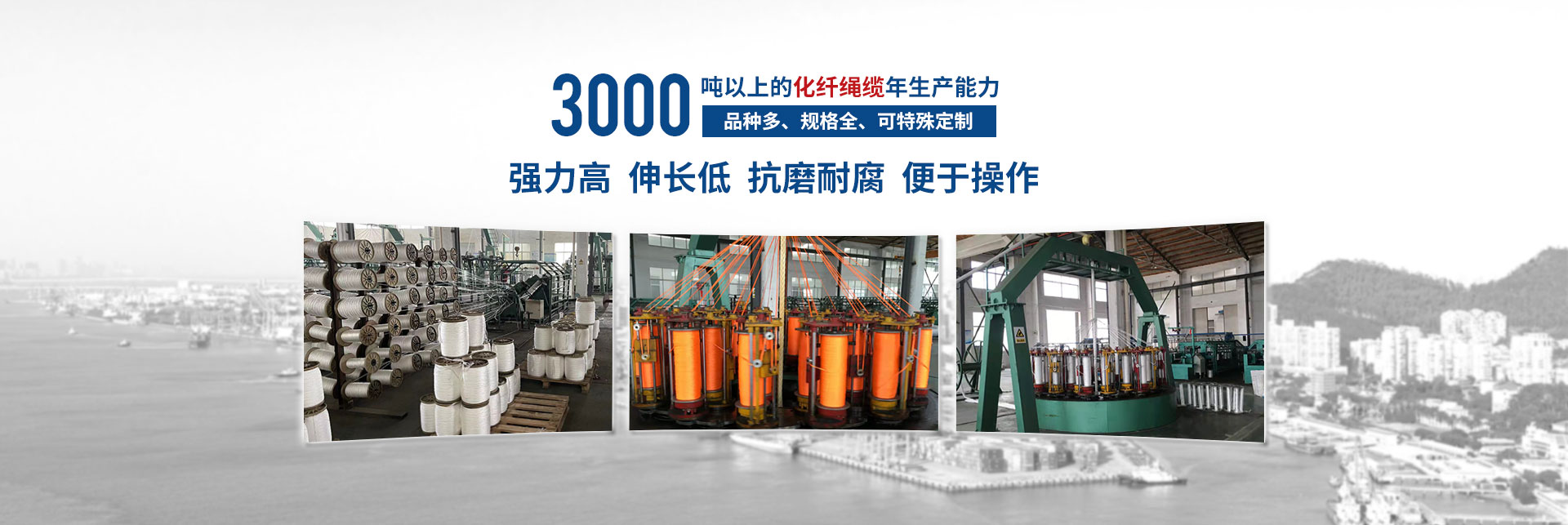 按國際標準生產的“繩龍”牌化纖繩纜,品種多、規格全,產品廣泛應用于遠洋運輸、船舶制造、漁業捕撈、港口作業,國防軍工、石油勘探等領域,取得市場廣泛認可和市場占有率。